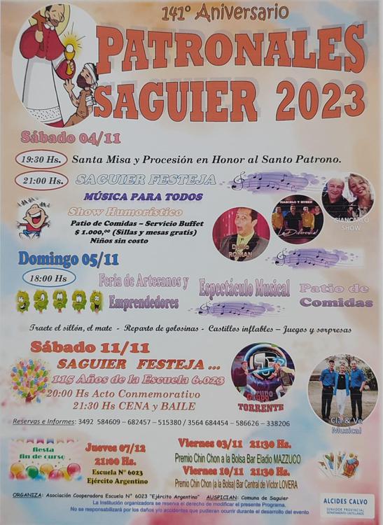 El sábado 4 de noviembre se realizará la tradicional misa y procesión en honor al Santo Patrono, a las 19:30 hs. Seguidamente, la comunidad podrá disfrutar de un encuentro con shows humorísticos y musicales.