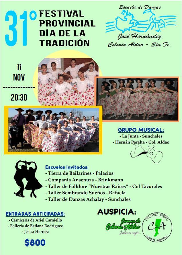 El festival es organizado por la Escuela de Danzas "José Hernández" dependiente de la Comuna local y se realizará el próximo 11 de noviembre a partir de las 20:30 hs. La entrada tendrá un valor de $800 y se podrán adquirir en los siguientes lugares: Carnicería, de Ariel Carnielo; Pollería, de Betiana Rodriguez; Jésica Herrera.